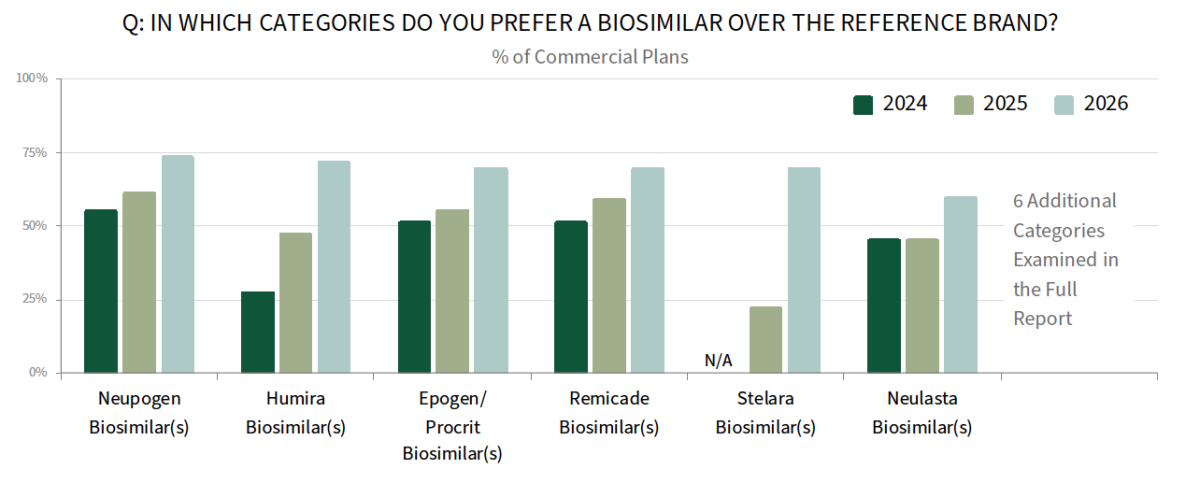 Biosimilars Reach a True Inflection Point. What was once a slow transition has accelerated as plans are now actively preferring biosimilars and using them as a primary lever to manage specialty spend. Plans report increased adoption of biosimilars in all categories measured, with a notable increase in adoption of STELARA and HUMIRA biosimilars over their reference brands in 2026. Commercial plans are also growing beyond new-start policies toward more active conversion in their utilization management approach.
