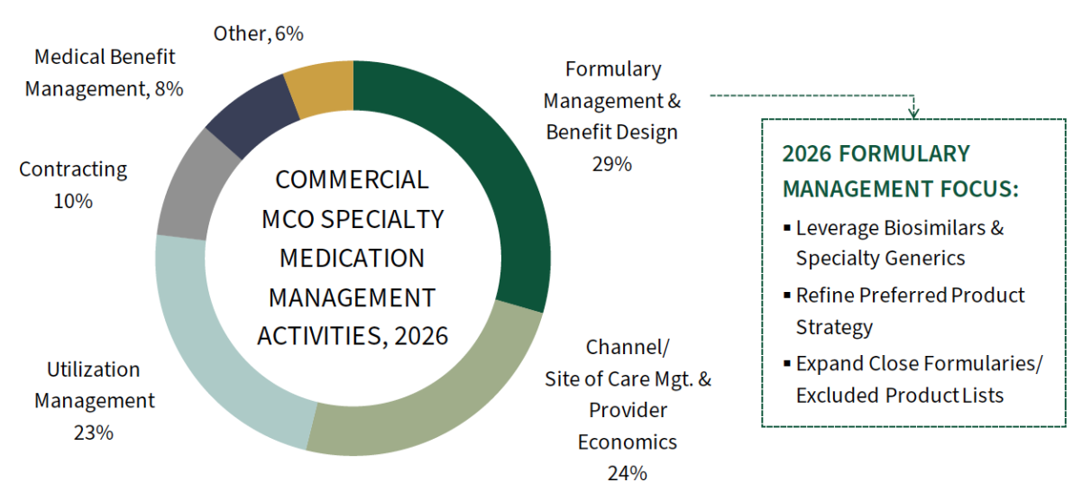 Formulary Management Among Plans' Leading Specialty Drug Cost Containment Strategies in 2026. Commercial health plans were asked what their organization is most focused on in 2026 to better manage the cost and utilization of specialty pharmaceuticals. Plans' activities are most often centered in formulary management, channel/site of care management and provider economics, and traditional utilization management tactics.