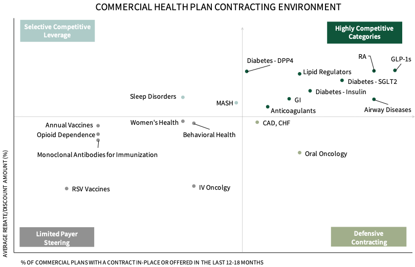 Contracting Environment in the Commercial Health Plan Segment. Data suggests that the most aggressive contracting with commercial health plans is concentrated in categories with high brand competition and therapeutic substitutes, such as GLP-1's for obesity/diabetes and rheumatoid arthritis. Alternatively, categories such as vaccines show minimal payer contracting influence, with utilization largely driven by providers or public health coverage requirements.