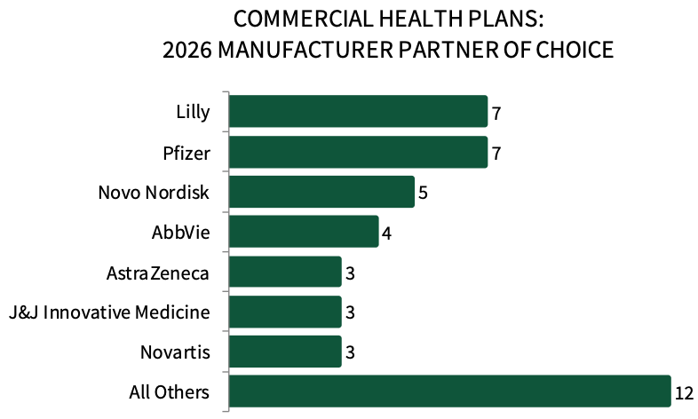 Lilly & Pfizer Lead as Plans' Top Partners of Choice in 2026. Lilly and Pfizer are most often nominated as commercial health plans' overall Partners of Choice in 2026. The primary factors driving nominations include demonstrating an understanding of customers' business needs & bringing relevant resources, account management support/personnel, and a firms' willingness to contract.