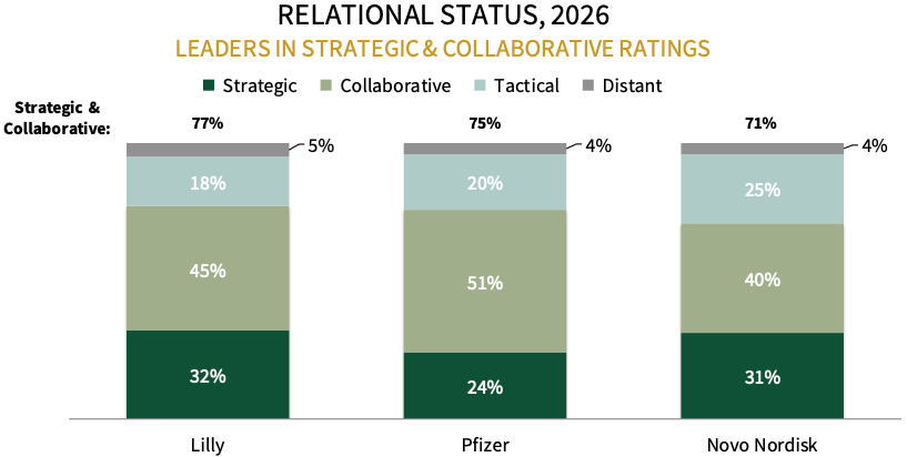 Lilly Leads with the Most Collaborative Payer Relationships in 2026. Managed markets customers were asked to rate their relationships with 30+ manufacturers from distant to strategic. Lilly leads with about 77% of panelists reporting their relationship as collaborative and/or strategic. Pfizer and Novo Nordisk follow, with over 70% of respondents rating their relationship with each company as collaborative and/or strategic.