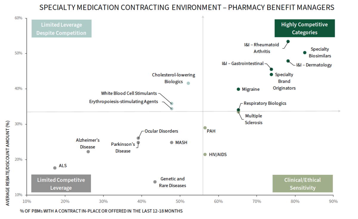 Rebates Remain Central to Contracting, but the Model is Evolving Amid Growing Policy Pressures. The below chart maps contract prevalence (share of PBMs with a contract in-place or offered) against average reported rebate levels across specialty therapeutic areas, showing where higher intensity contracting is observed–namely in competitive areas like I&I and biosimilars. The full report provides a deep dive into the contracting for the below therapeutic classes.