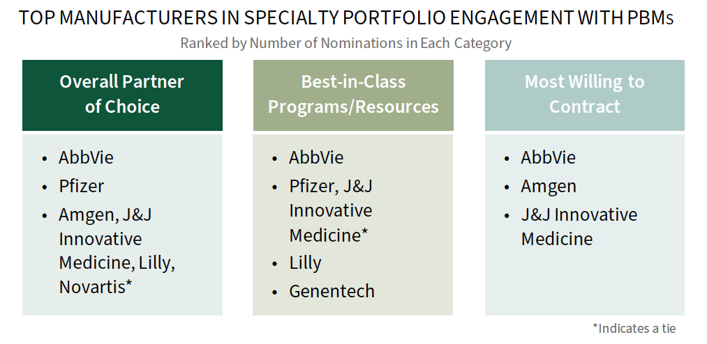 • Which manufacturers stand out as best in PBM engagement to support their specialty portfolios?