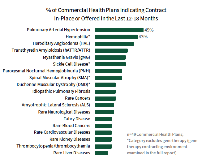 Financing & Contracting Considerations in Rare Disease. Commercial MCOs are evaluating a variety unique financial protection programs, benefit designs, and other methods to finance rare disease & gene therapies, discussed in the complete report. When it comes to contracting with manufacturers, approaches vary by therapy type. Traditional access-based contracts are most often reported in pulmonary arterial hypertension (PAH) and hemophilia, while a higher prevalence of risk/outcomes-based contracts are observed for gene therapies.
