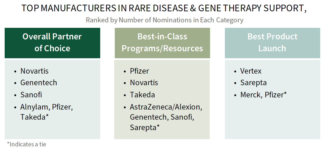 Many of the leading manufacturers in rare disease engagement have growing or robust rare disease portfolios, where products are accompanied by significant support services and novel contracting arrangements. The complete report provides the full listing of manufacturers recognized, drivers of best-in-class nominations, and a commercial MCO needs assessment.